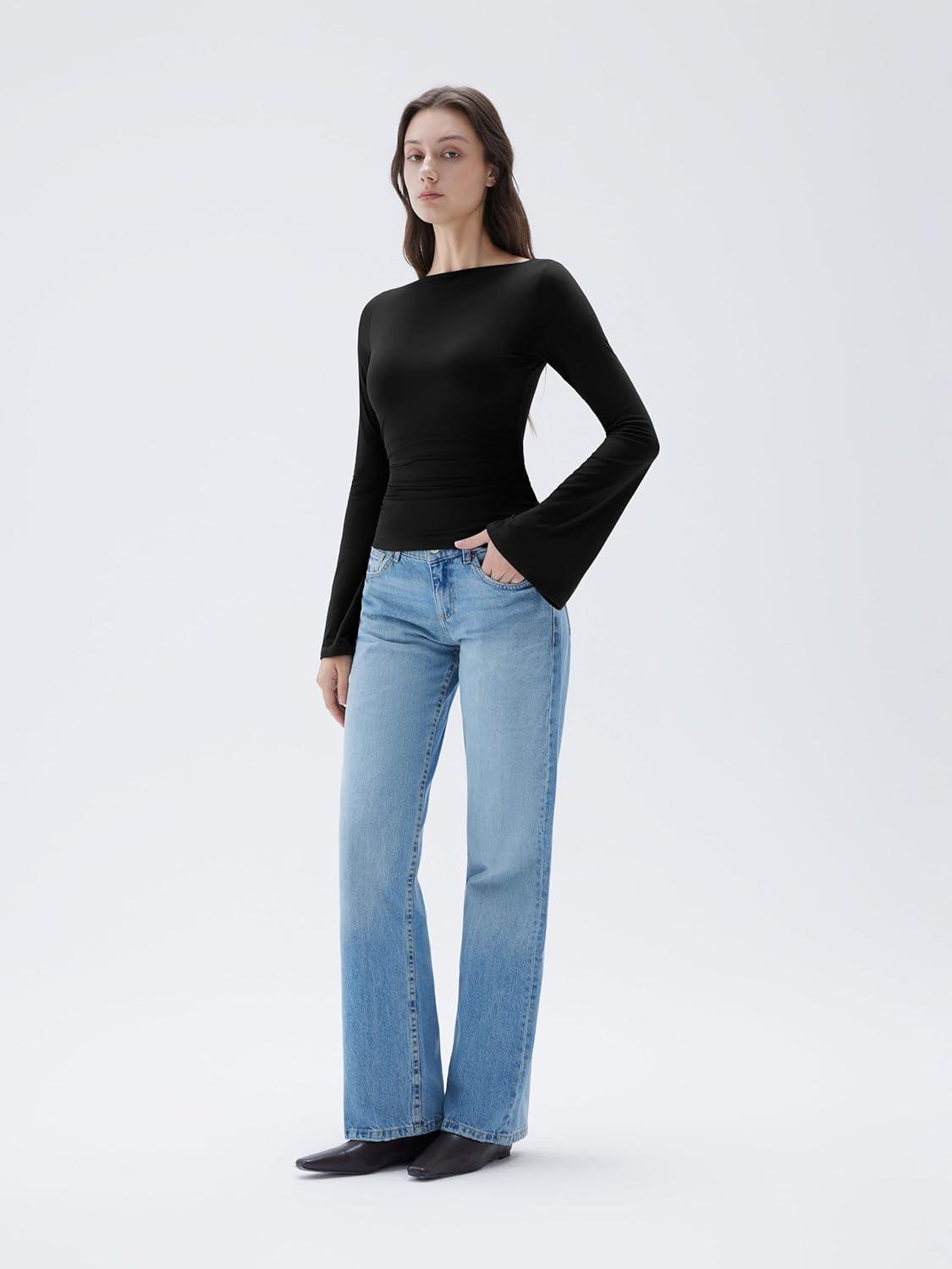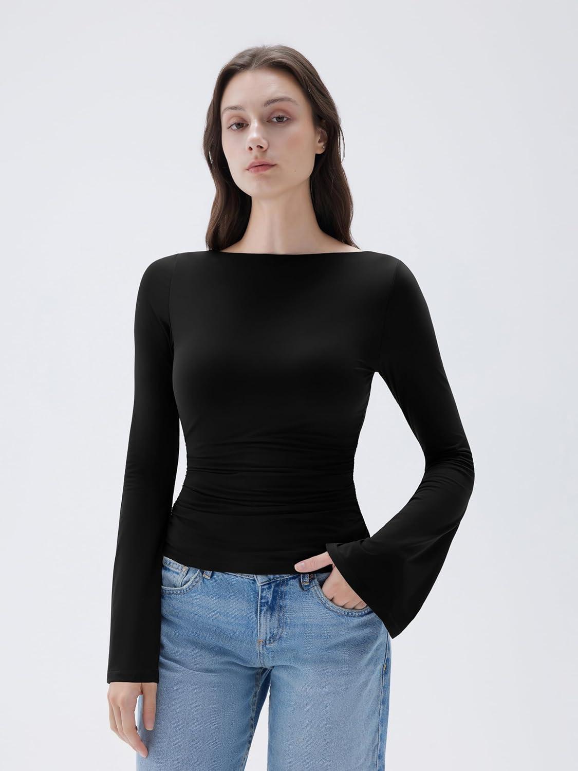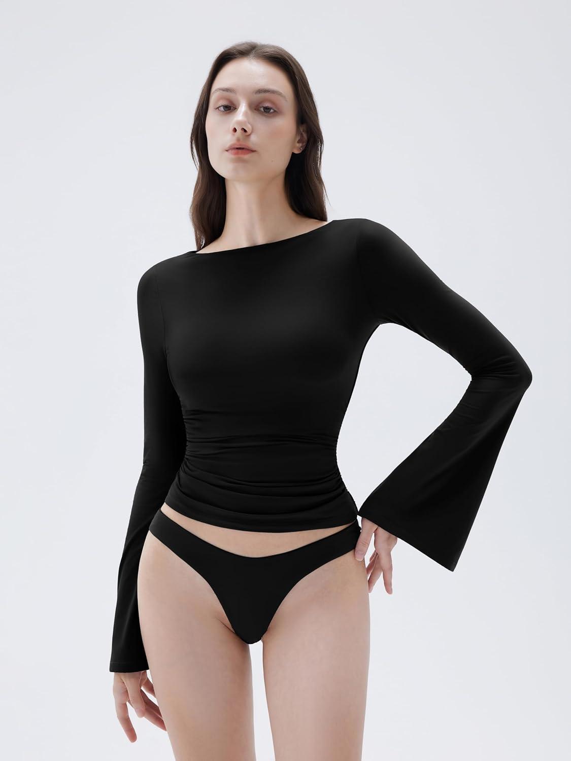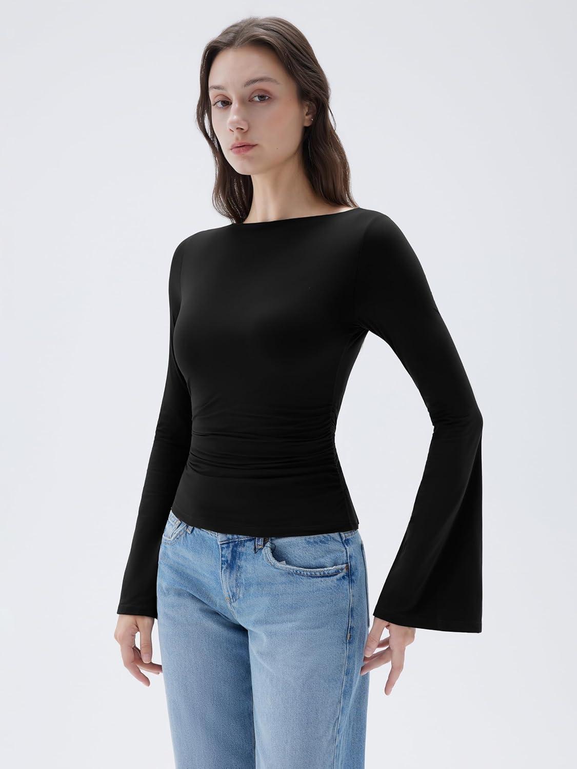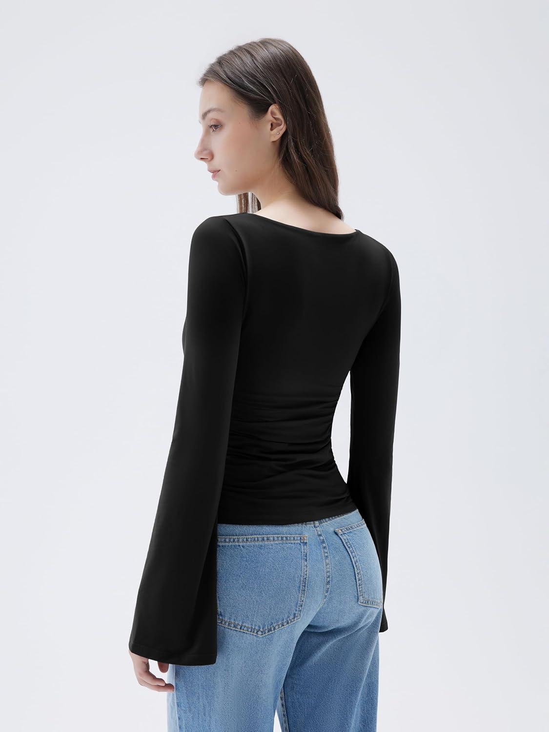 SUUKSESS Women Crew Neck Bell Sleeve Tops Double Lined Going Out Fitted Basic T Shirts(01 Black)