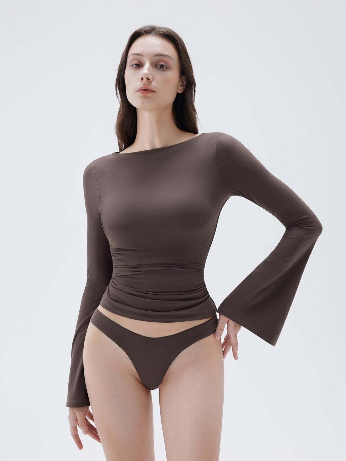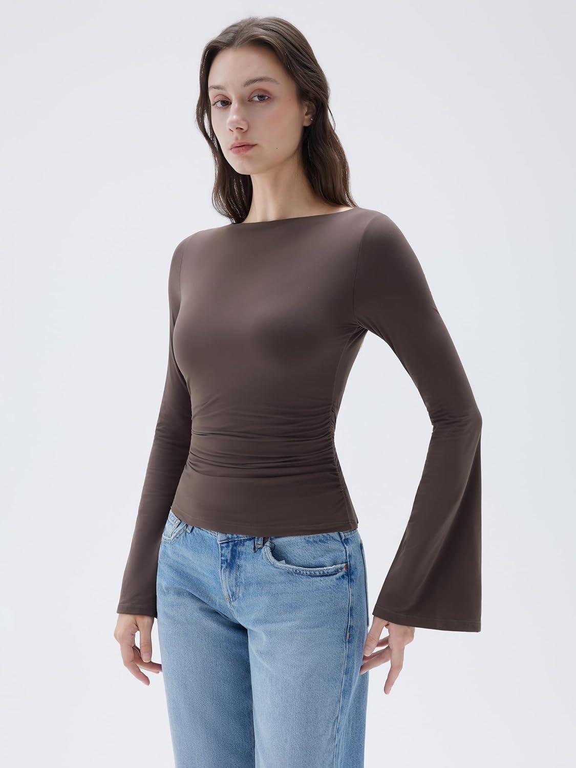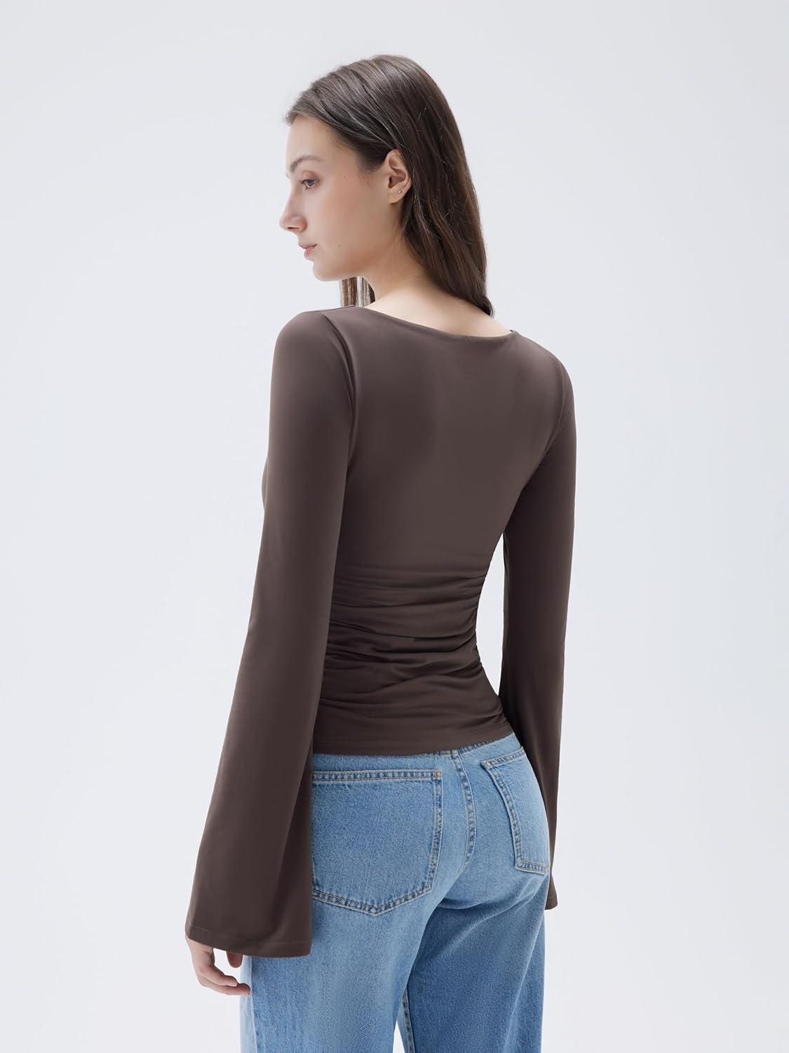 SUUKSESS Women Crew Neck Bell Sleeve Tops Double Lined Going Out Fitted Basic T Shirts(Brown)