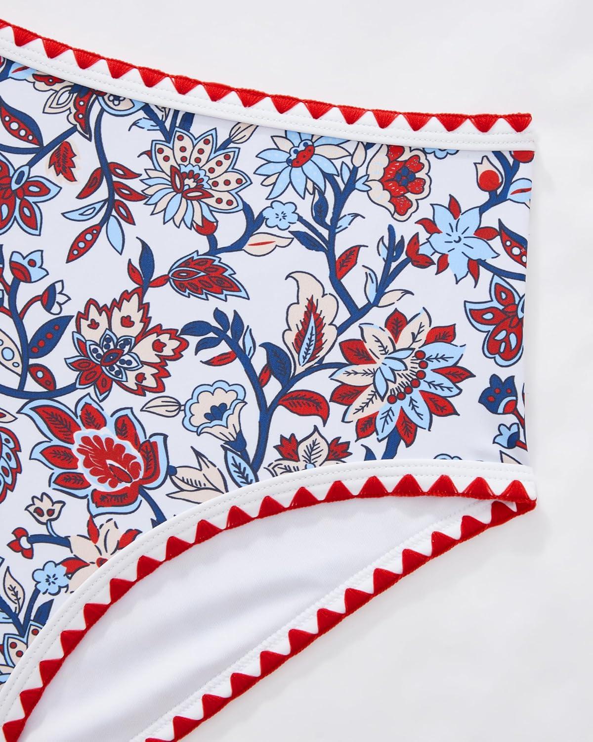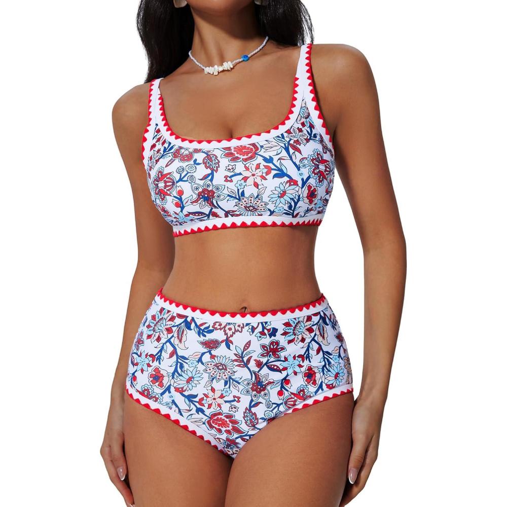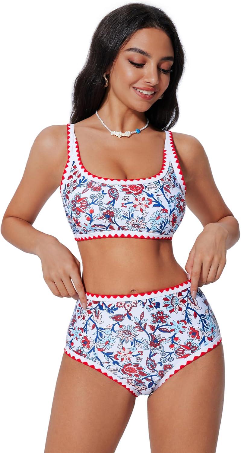 SUUKSESS Women High Waisted Bikini Set Floral Print Color Block 2 Piece Swimsuit(148 Red Floral)