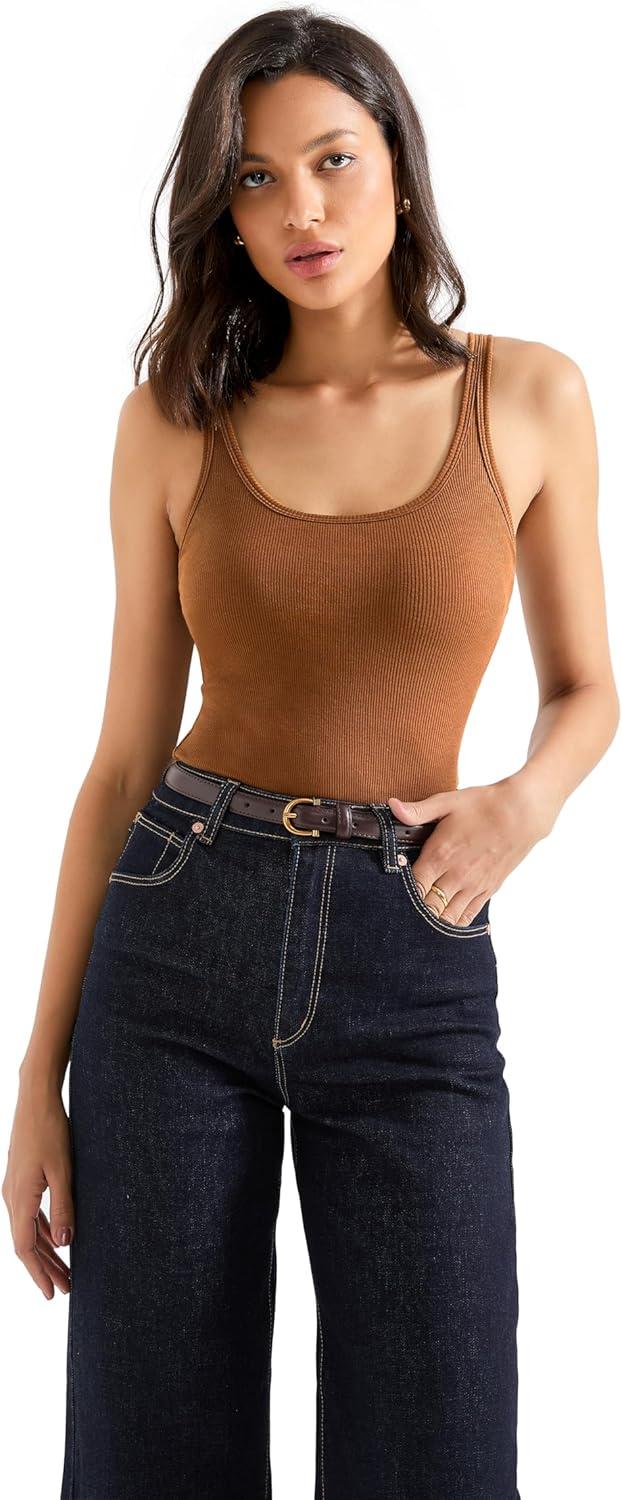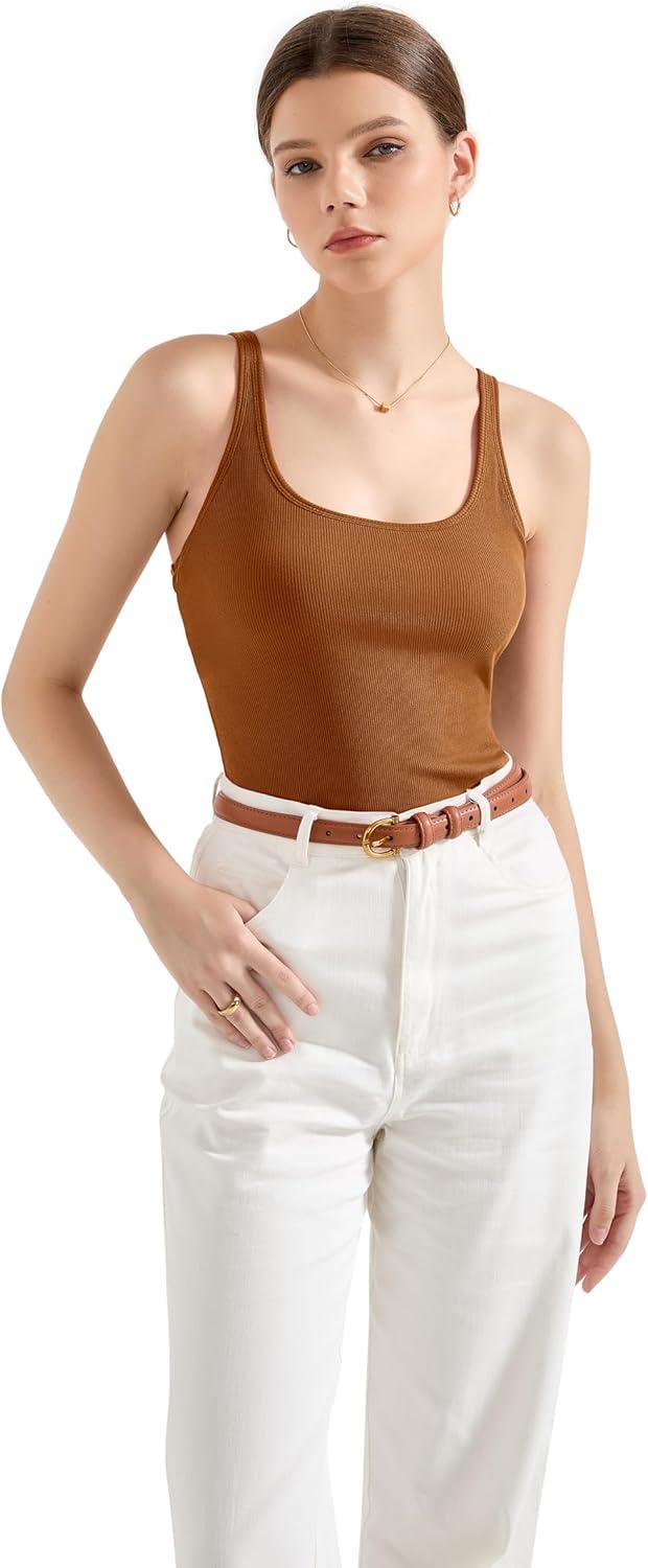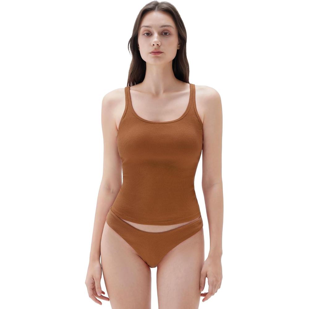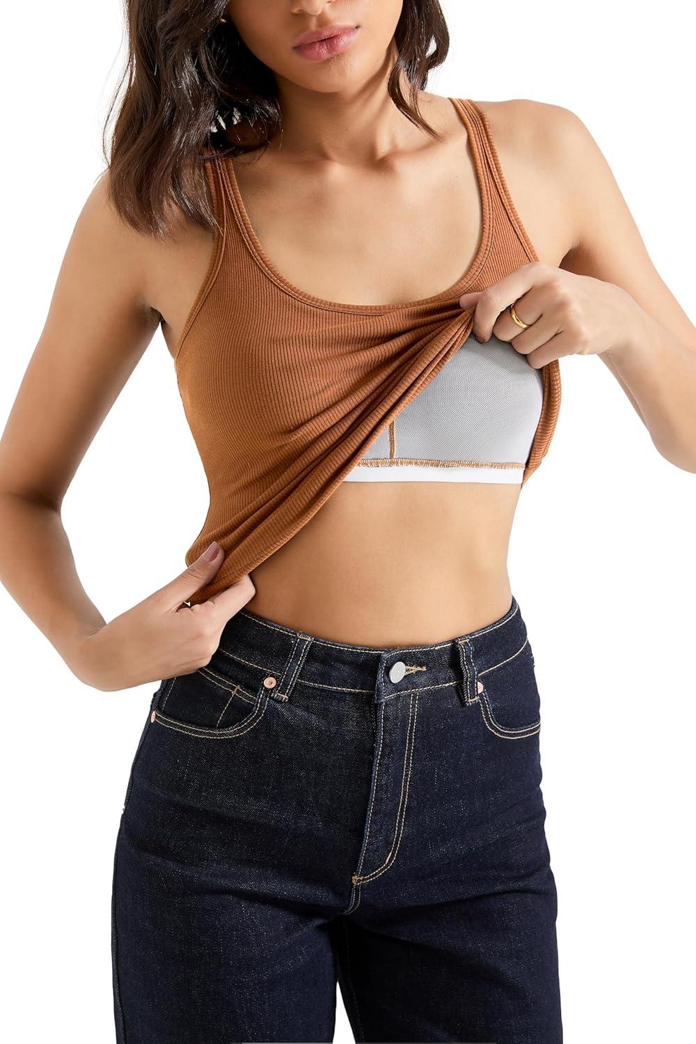SUUKSESS Women Padded Cotton Ribbed Long Tank Tops Casual Summer Going Out Sleeveless Scoop Neck Basic Cami Tops(Coffee)