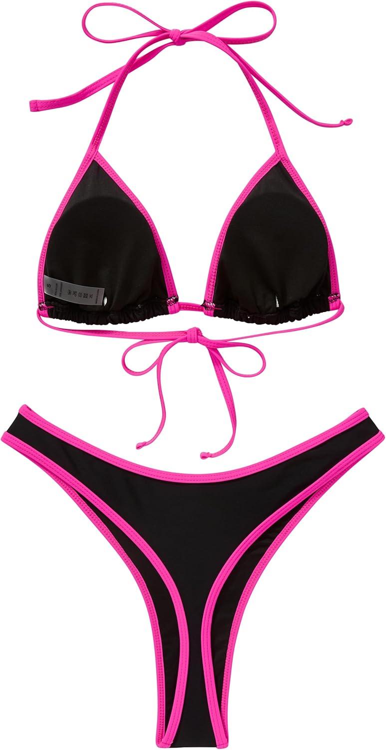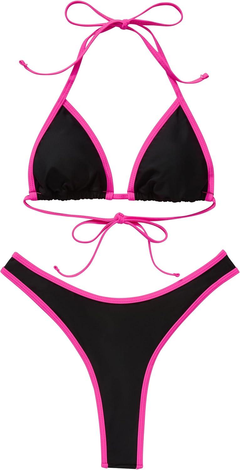 SUUKSESS Women Sexy Thong String 2 Piece Bikini Set Cheeky Halter Swimsuit(71 Black Pink)