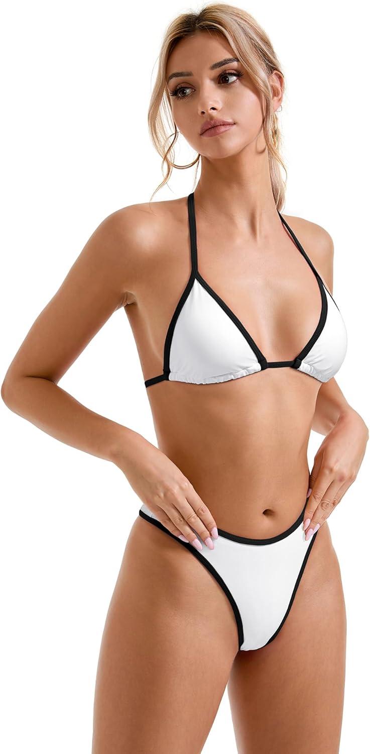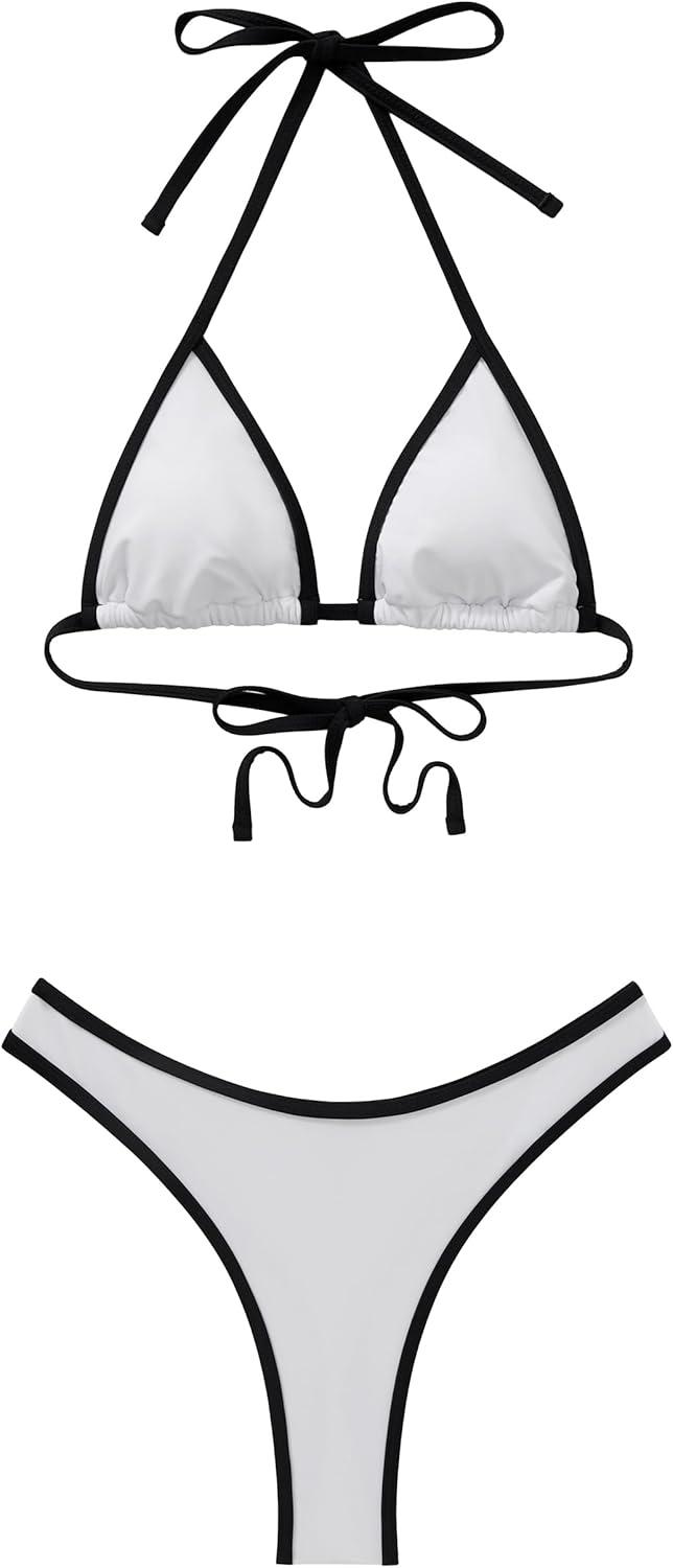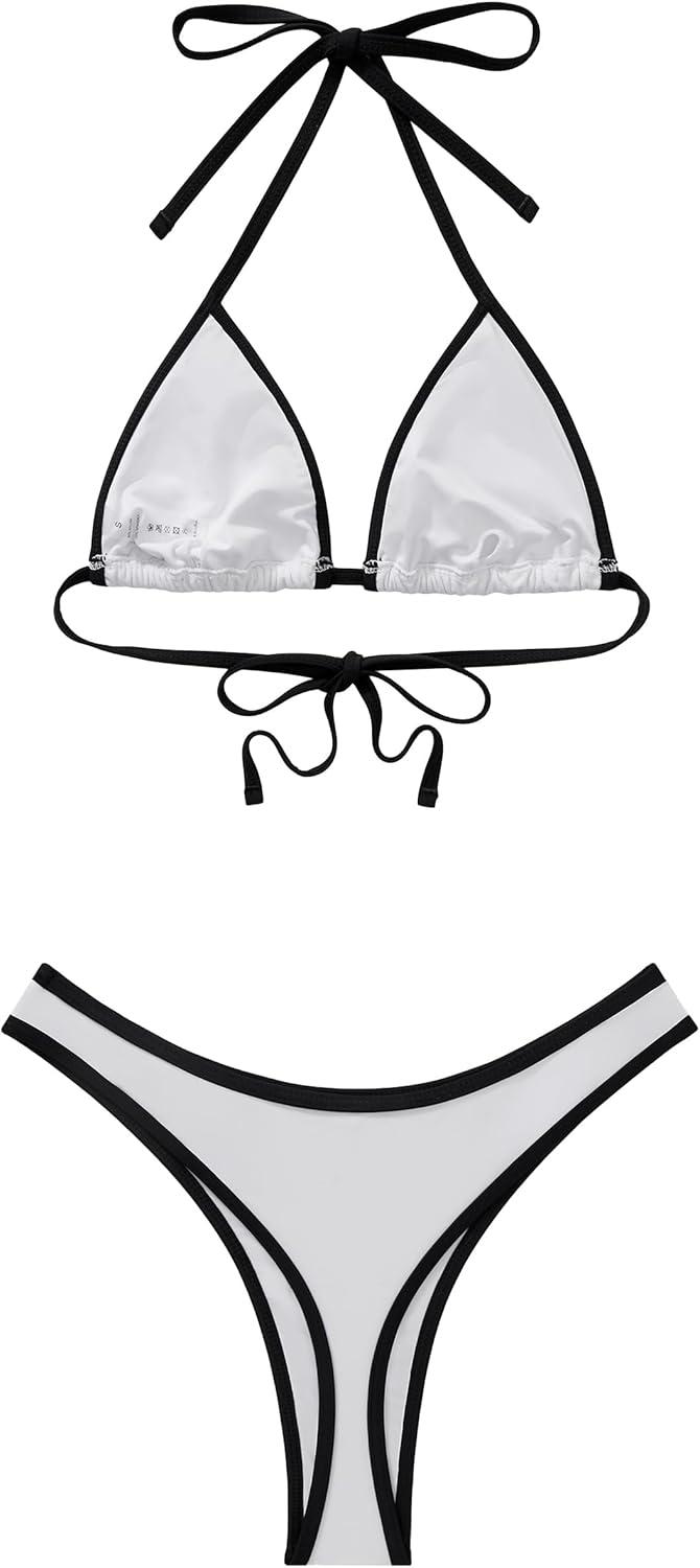SUUKSESS Women Sexy Thong String 2 Piece Bikini Set Cheeky Halter Swimsuit(71 White Black)